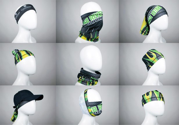 Using heat transfers, it’s possible to print over the entire gaiter in unlimited colors. Some gaiter suppliers offer custom decorating, or you can order blanks and use a contract decorator.