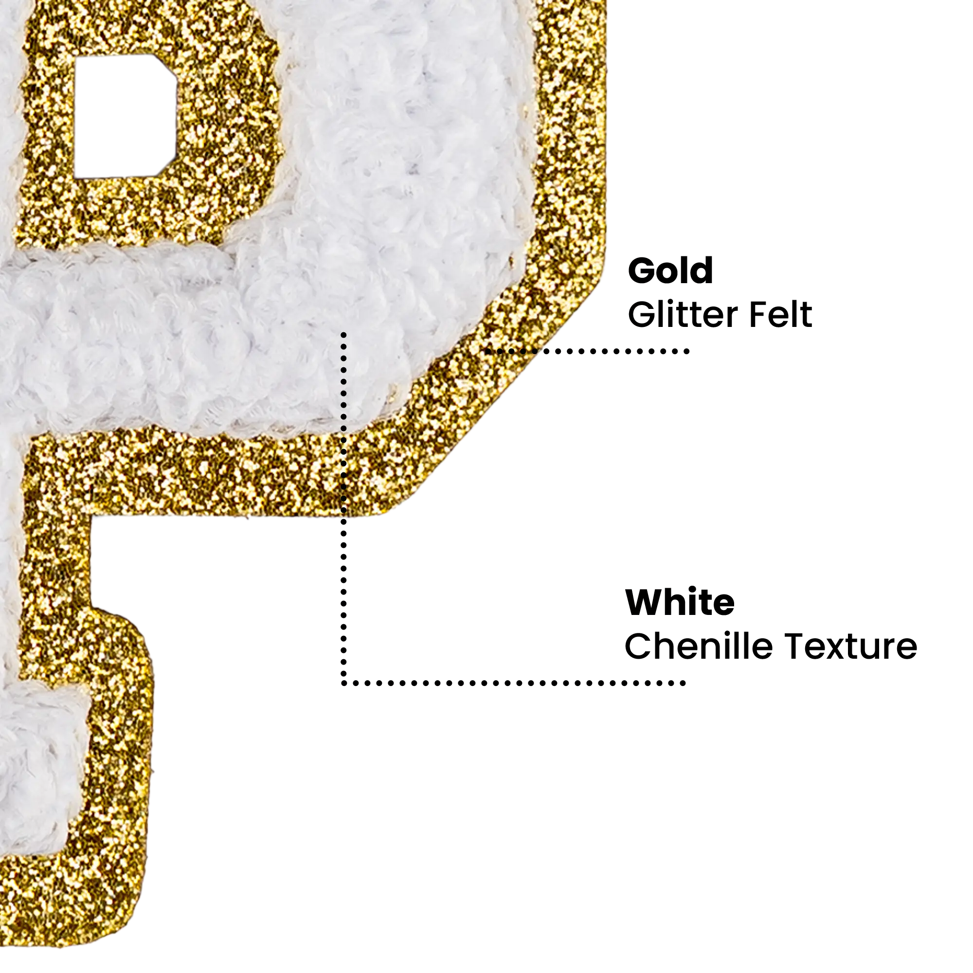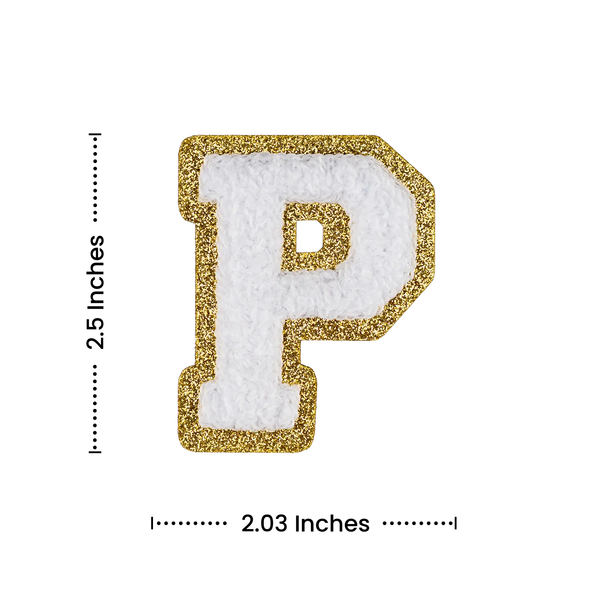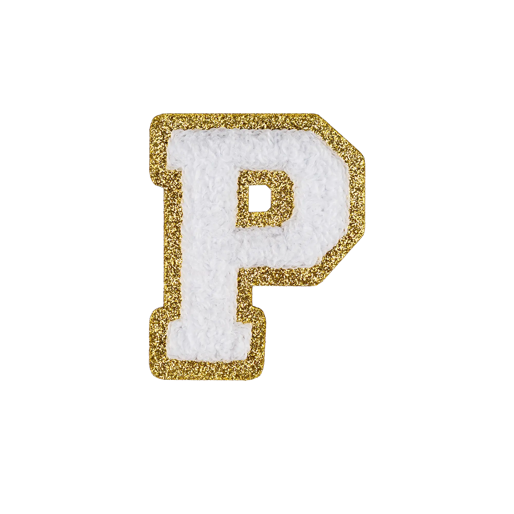 Pack of 25 - 2.5" - Chenille Letterman "P" Patch - White Chenille Thread/Gold Glitter Felt - Heat Applied Backing