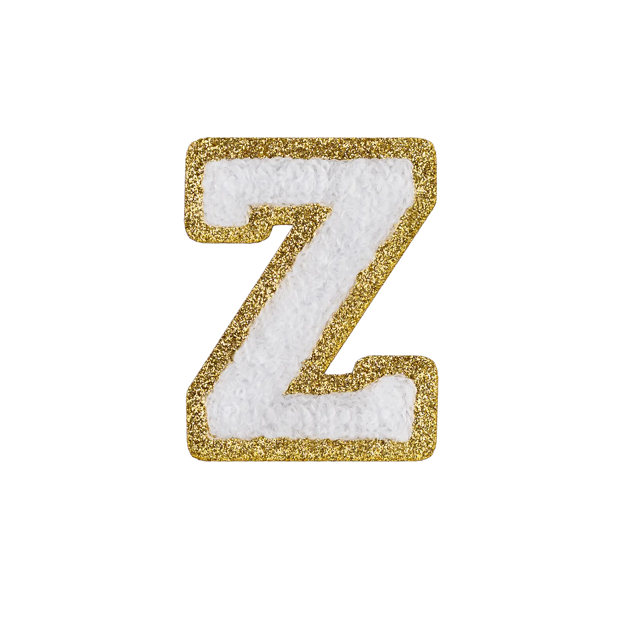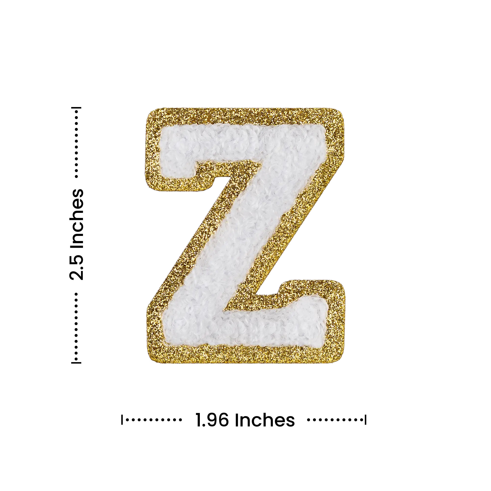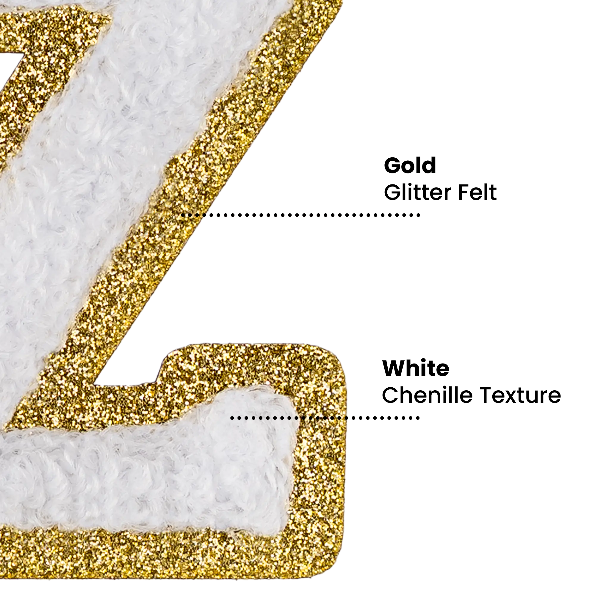 Pack of 25 - 2.5" - Chenille Letterman "Z" Patch - White Chenille Thread/Gold Glitter Felt - Peel & Stick Backing