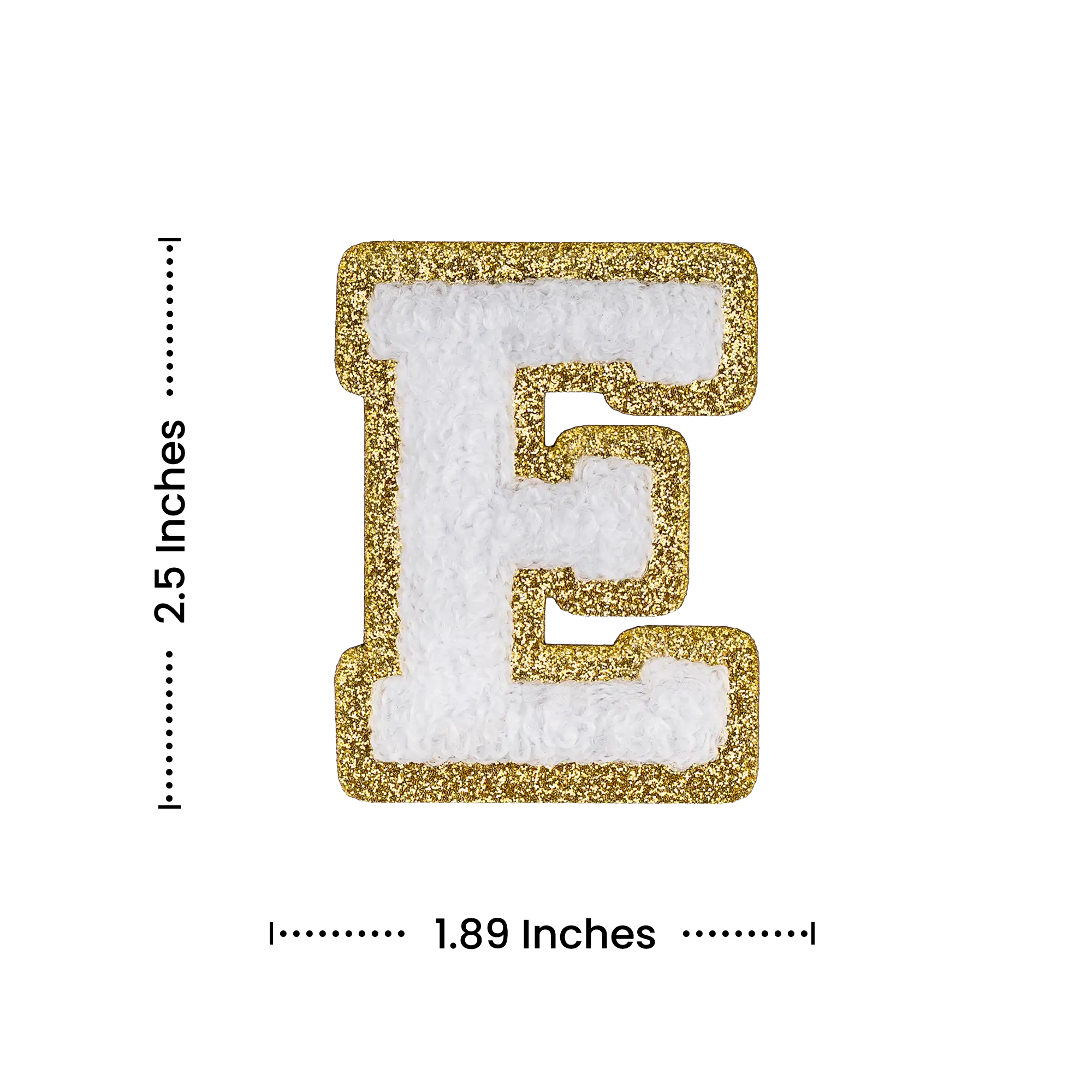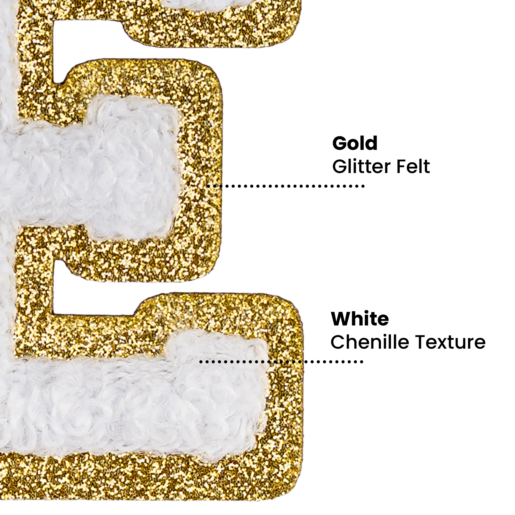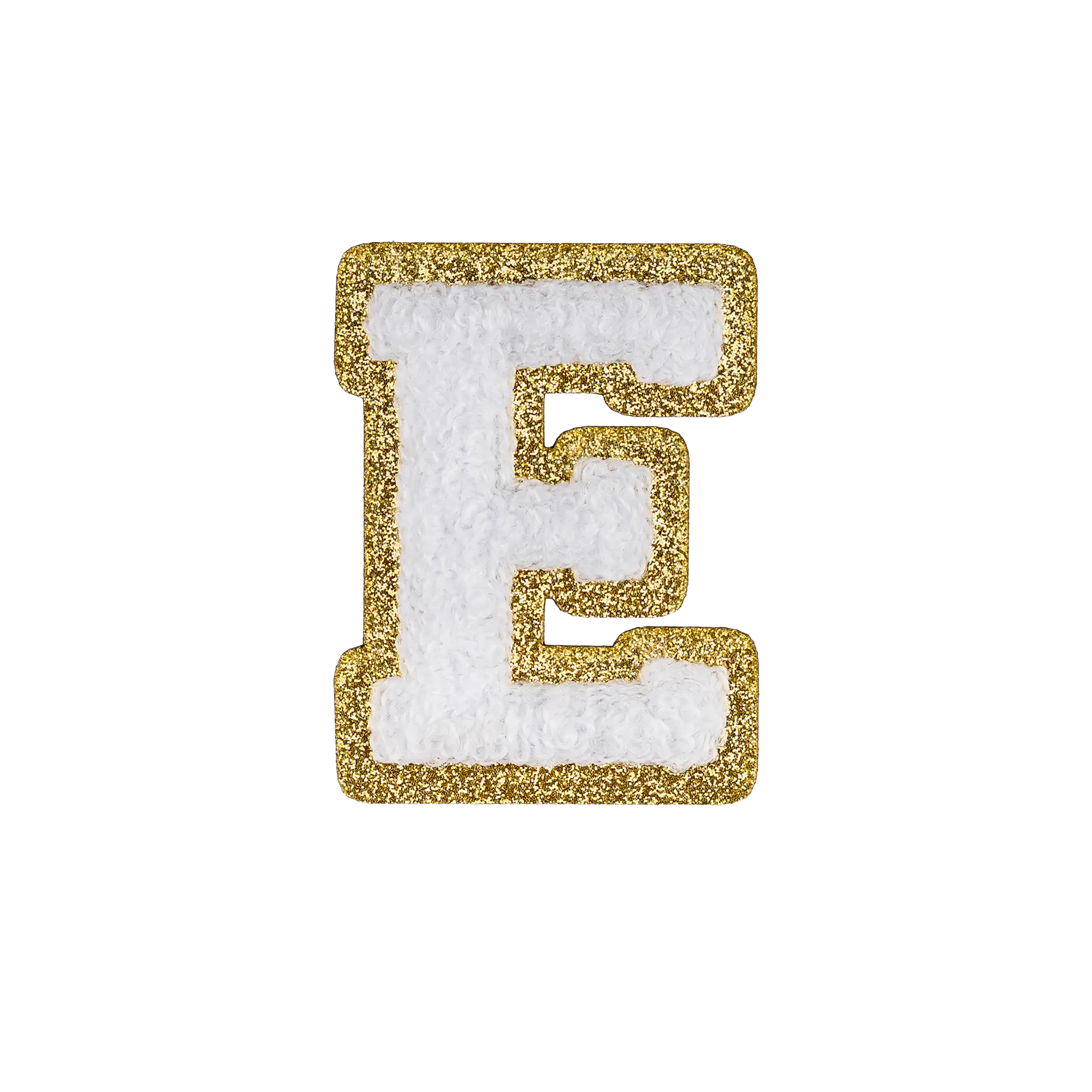 2.5" - Chenille Letterman "E" Patch - White Chenille Thread/Gold Glitter Felt - Peel & Stick Backing