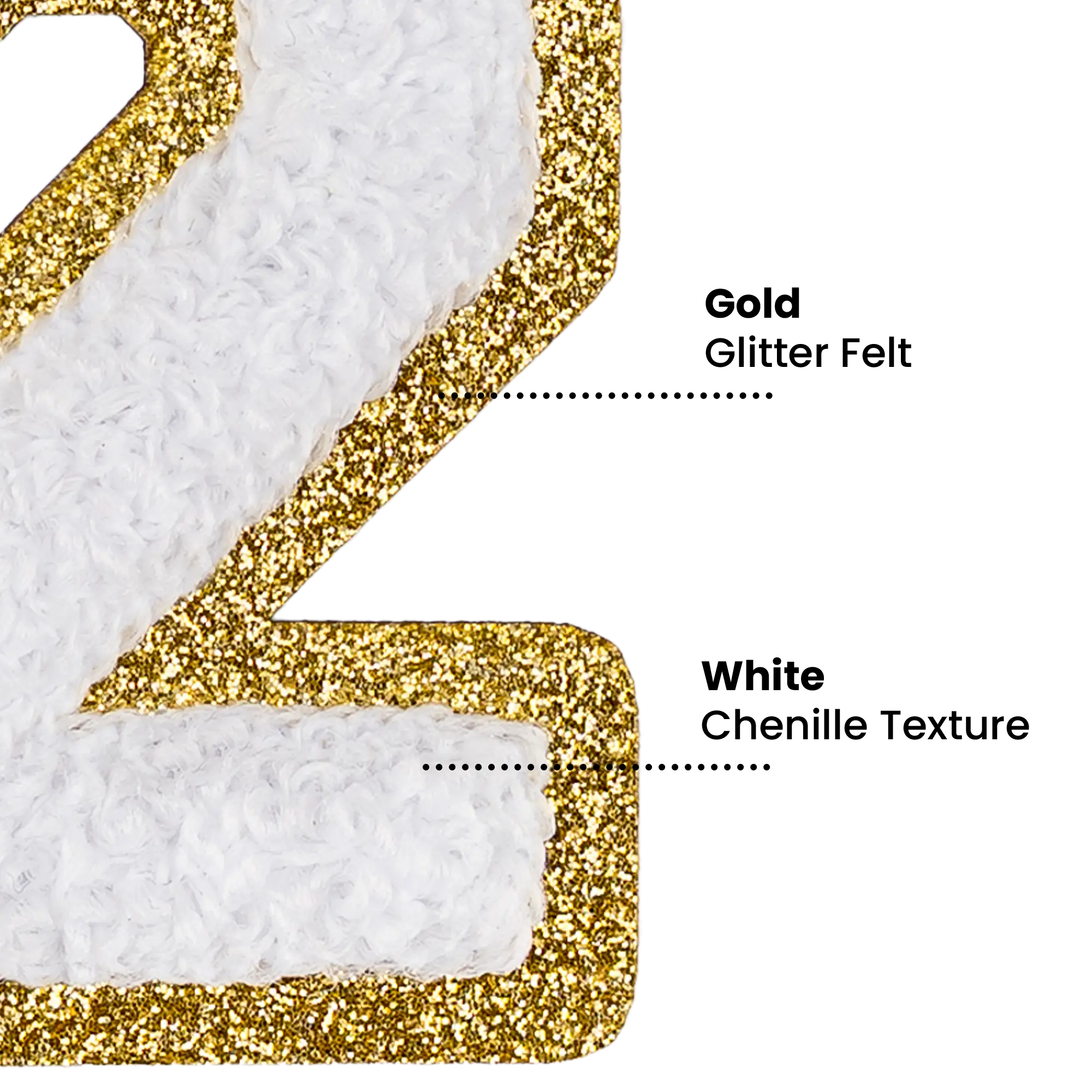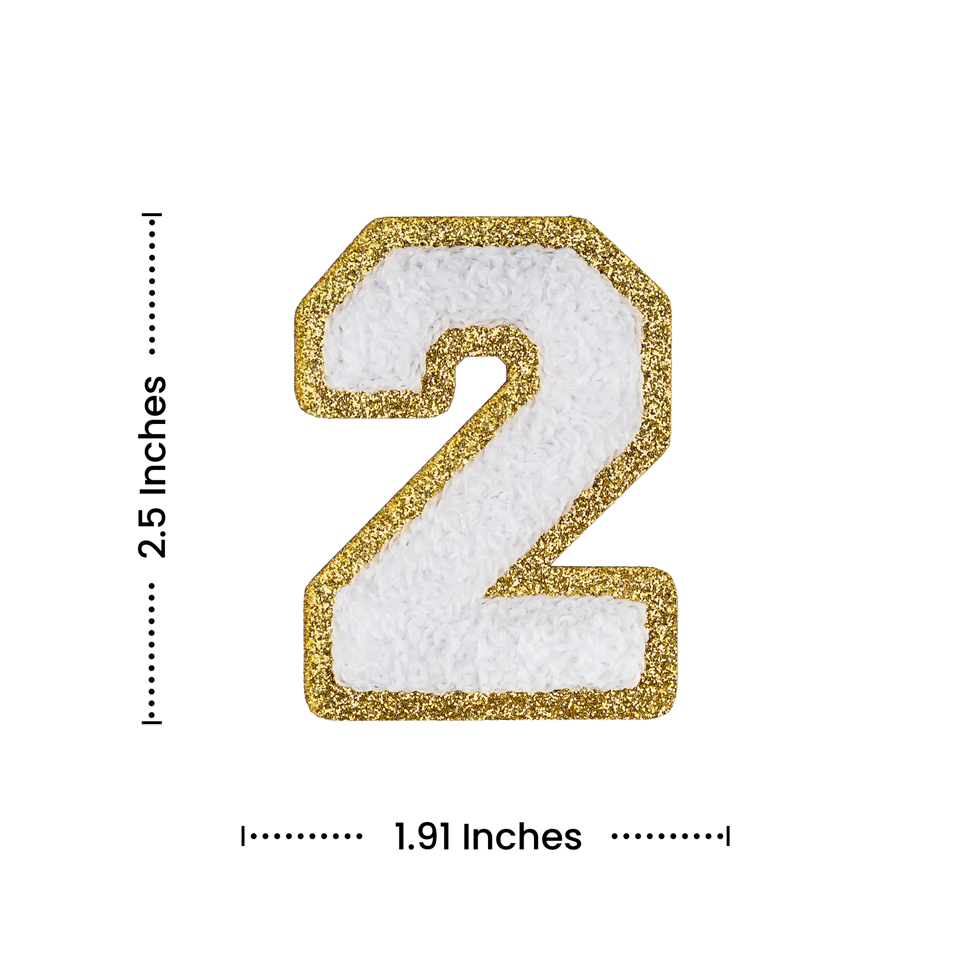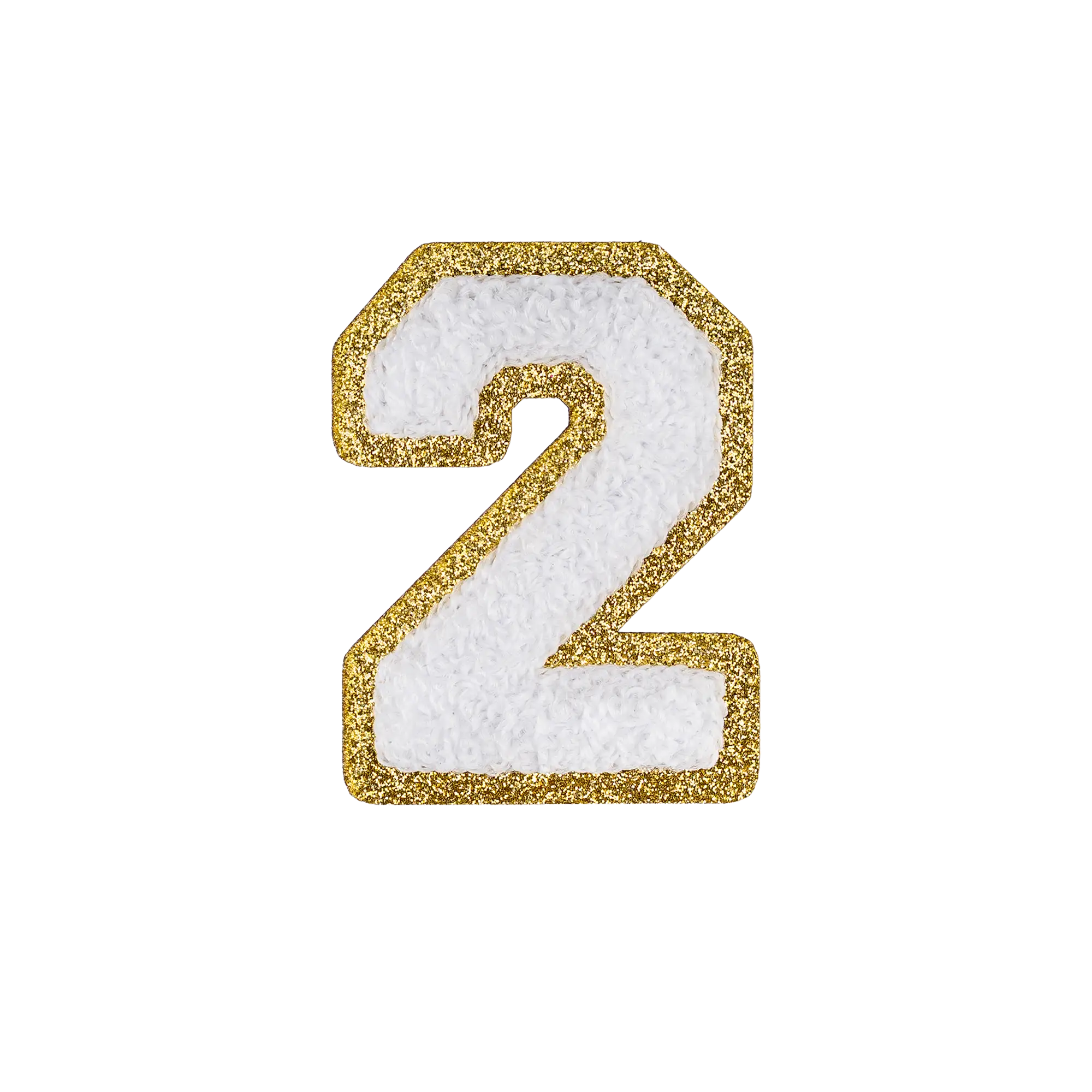 2.5" - Chenille Letterman "2" Patch - White Chenille Thread/Gold Glitter Felt - Peel & Stick Backing